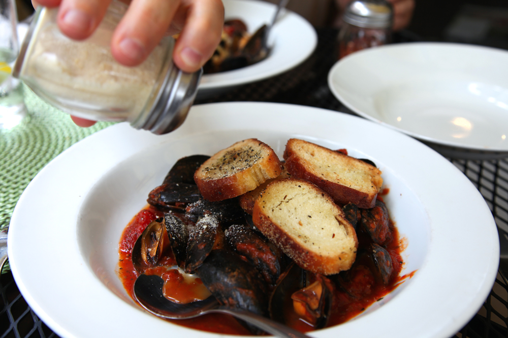 After these long walks in the fresh air, one tends to get a bit hungry. The best choice for me is seafood. Here, my husband douses the pasta in Parmesan. It was a mistake. The Parmesan needs to be authentic.